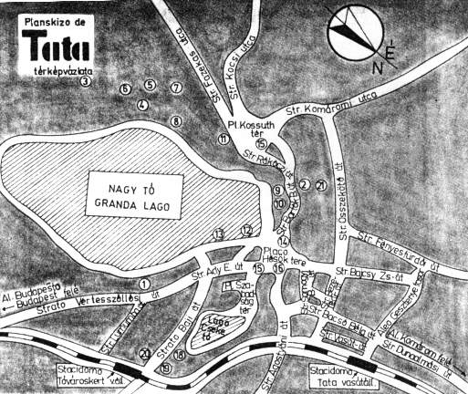 Antaŭ ĝi kuŝas la fama subĉiela teatro de Tata, kies pitoreskan fonon donas grandega makulplena platano per siaj branĉoj kubutumantaj sur la teron. Malantaŭ la granda platano, tra la ombroriĉa branĉaro de la arboj frapas niajn okulojn la modernaj konstruaĵoj de la Tutlandaj Trejnadestabloj, kie altkvalitaj sportistoj de nia patrujo preparas sin al la grandaj internaciaj konkursoj.