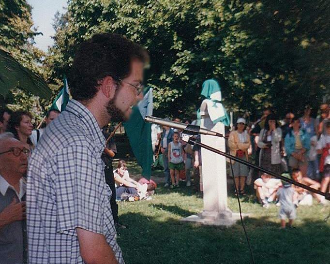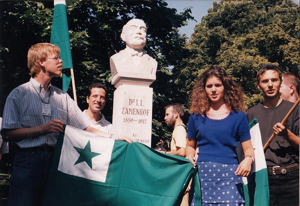 Ellopják a szobrot A rendszerváltás utáni években nagy problémát jelentettek a színesfém-tolvajok, akik nem kímélték a köztéri szobrokat sem. Az Eszperantó Parkban is ellopták 1994-ben a bronzból készített Zamenhof szobrot, de szerencsére egy ifjú szerelmespár megzavarta a tolvajokat, akik így a szobrot egy bokor alá rejtették. A szobrot kutyasétáltatók találták meg, értesítették a posztos rendőrt, aki bevitette azt a Budapest Galériába. A galéria igazgatója azt igérte, hogy a Rác fürdő építkezésének és a parkosításnak a befejezésekor majd visszahelyezik a szobrot. Ez két év múlva, 1996-ban történt meg. Az öröm sajnos nem tartott sokáig, mert 2 év múlva, 1998-ban a szobrot újra ellopták - de sajnos most már sikerrel. A lopásról telefaxon értesítettünk több újságot is, és több helyen meg is jelent a hír. Nagy meglepetésünkre másnap az egyik újságban ujjnyi vastag címmel jelent meg egy cikk, és benne hogy "Ellopták a Zamenhof-szobrot, mert a tolvaj Lenin-fejnek nézte azt..." - A telefax gyenge minőségű fotója alapján valószínűleg a riporter látott benne hasonlóságot. A szobor sajnos nem került elő, de ez az újságcikk akkor elég nagy reklámot csinált az eszperantónak... :-) ![]() Új szobor készült 1999-ben Az ellopott szobor pótlását végül az Eszperantó Alapítvány vette kézbe. A Slezák-család anyagi felajánlása alapján Berecz Péter szobrász mészkőből készült alkotása az 1999-es Ifjúsági Eszperantó Világkongresszus keretében lett felállítva. Az adományozó nevét a szobor hátoldalán egy kis réztábla jelezte - de pár év múlva azt is ellopták... :-( - Megható volt, hogy az ünnepélyes avatáson több tucat országból újra 500 fiatal özönlötte el a teret... A Magyar Ifjúsági Eszperantó Szövetség nevében Golden Dániel, az ifjúsági szervezet vezetője avatta fel a szobrot.